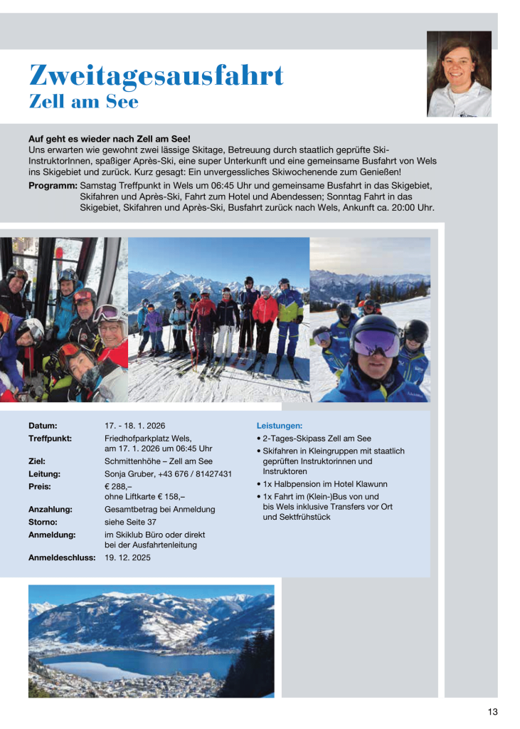 | Zweitagesausfahrt | Zell am See | 17.01.26 - 18.01.26 | 06:45 am Friedhofparkplatz | 19.12.25 |