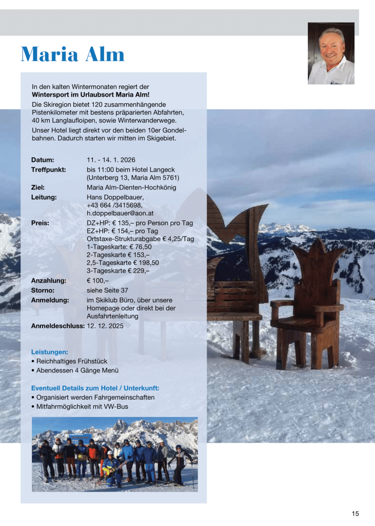 | Maria Alm | Hochkönig | 11.01.26 - 14.01.25 | Selbstanreise | 12.12.25 |