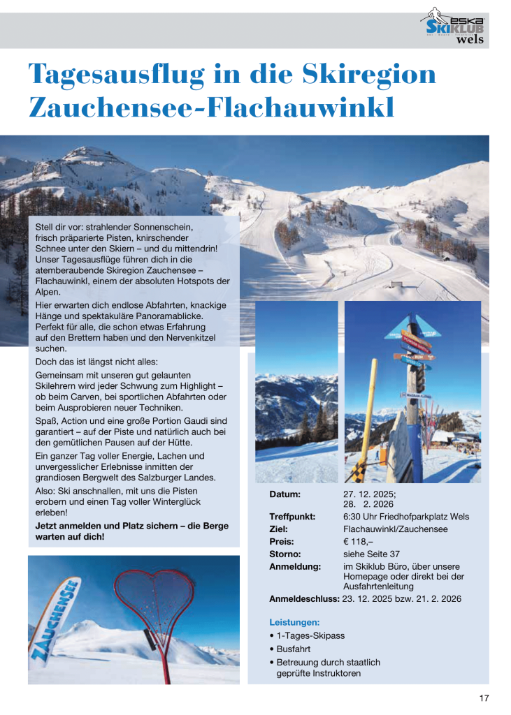 | Skiexpress | Zauchensee/Flachauwinkl | 27.12.25 | 06:30 am Friedhofparkplatz | 23.12.25 |