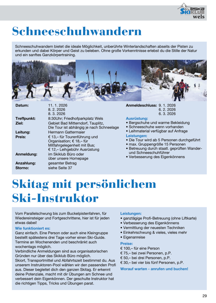 | Schneeschuhwandern | Bad Mitterndorf | 08.02.26 | 08:15 am Friedhofparkplatz | 06.02.26 |