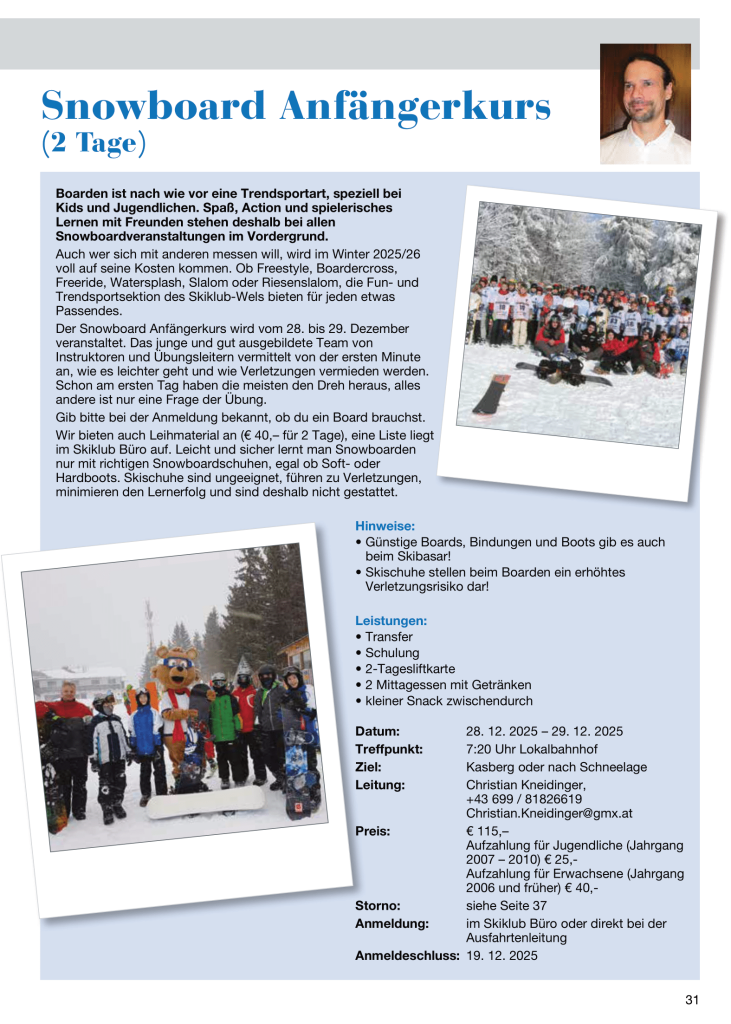 | Snowboard Anfängerkurs | Grünau/Kasberg | 28.12.25 - 29.12.25 | 7:20 am Lokalbahhof | 19.12.25 |