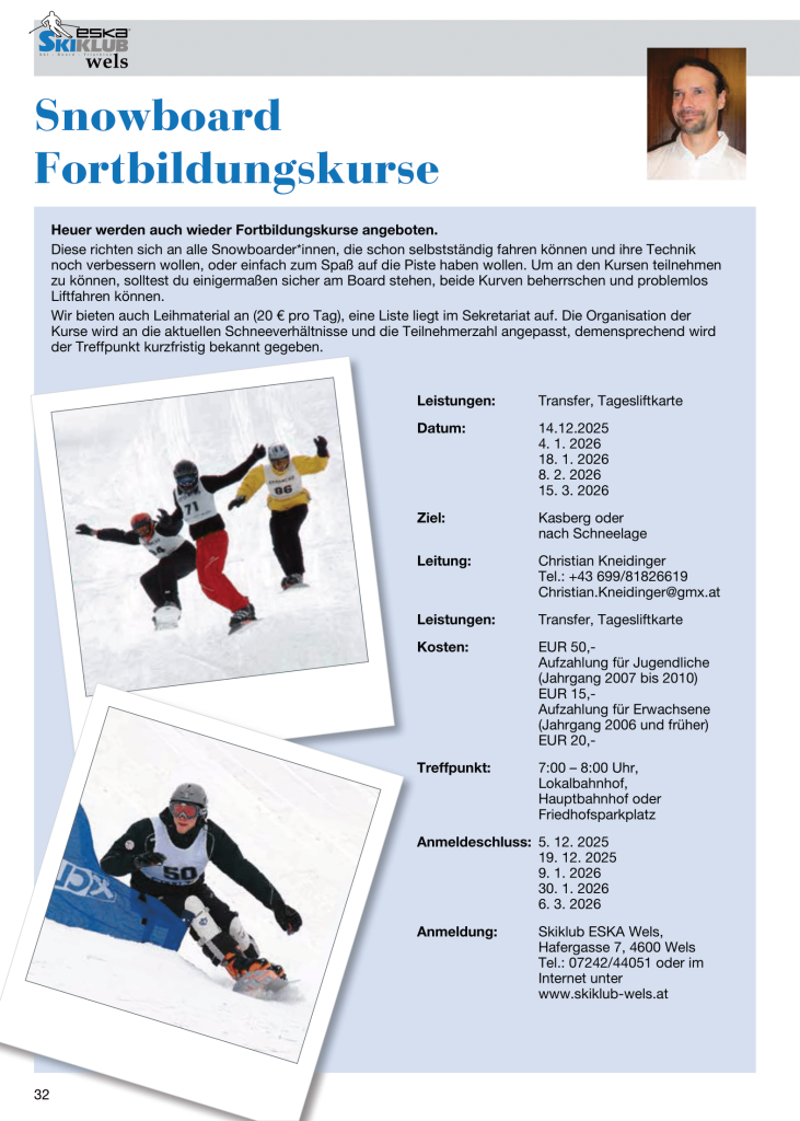 | Snowboard Fortbildung | Grünau/Kasberg | 15.03.2026 | 7:00 – 8:00 nach Absprache | 06.03.26 |